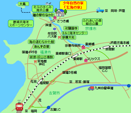 JR東郷駅(北口)バス停〜「牟田尻」バス停(西鉄バス宗像・約15分)