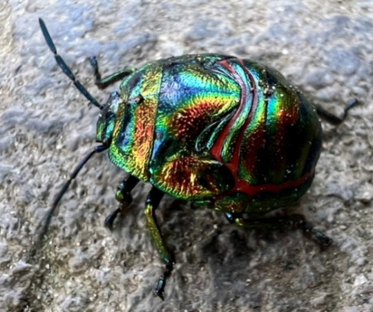 | 問題です! 写真の生き物の名前はなんでしょうか? 答えはニシキキンカメムシと言います。そうです、実はカメムシなんです! とても色鮮やかで美しい色をしていますね。 ニシキキンカメムシは山頂付近に生息しています。 皆さんも英彦山周辺に来られた際はさがしてみてください。 |