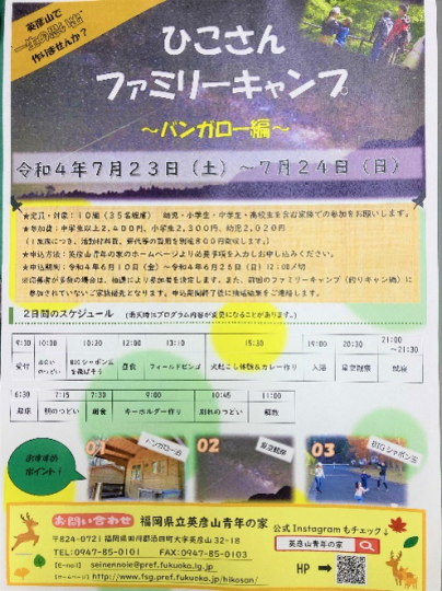 | ひこさんファミリーキャンプ〜バンガロー編〜を開催します。 【開催日】7月23日(土)〜7月24日(日) 【会場】福岡県立英彦山青年の家 【対象】幼児・小学生・中学生・高校生を含む家族 【定員】10家族 35名程度 【申込期間】令和4年6月10日(金)〜6月26日(日)12:00〆切 詳しくは、英彦山青年の家のHPをご確認ください。 皆さんのご参加をお待ちしております。 ※応募人数が定員を超えた場合は、抽選をさせていただきます。 |
