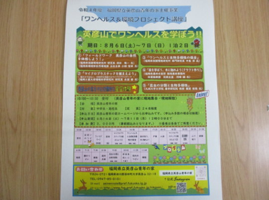 | 令和4年度主催事業「ワンヘルス&環境プロジェクト講座」を開催します。 【開催日】8月6日(土)〜8月7日(日)1泊2日 【会場】福岡県立英彦山青年の家 【対象】中学生・高校生 【定員】24名程度 【申込期間】令和4年6月14日(火)〜7月11日(月)12時00分まで 【参加費】3,000円 詳しくは、英彦山青年の家のHPまたは下記のURLより申込みください。 URL:https://shinsei.pref.fukuoka.lg.jp/Szdk8EI7 皆さんの参加をお待ちしております。 ※応募人数が定員を超えた場合は、抽選をさせていただきます。 |