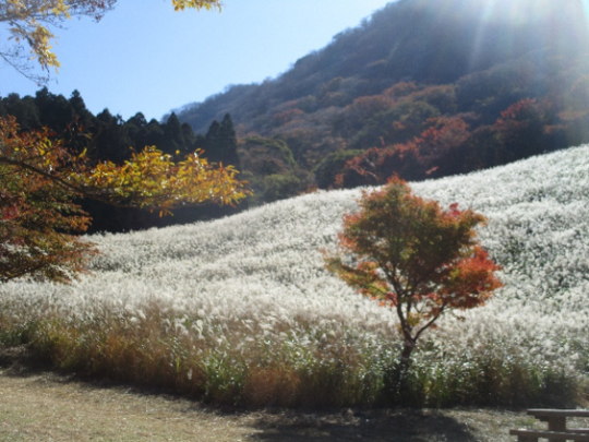 | 11/9に撮影した鷹巣原高原のススキです。 全体にススキが広がっており、白い絨毯のように見えてとてもきれいですね。 また、青年の家からススキまで行く道なりには紅葉が色鮮やかに咲いています。 ススキを見るついでに紅葉も楽しめます。 今の時期にしか見られない光景ですので英彦山青年の家に来られた際は是非ススキと紅葉を満喫されてください。 |