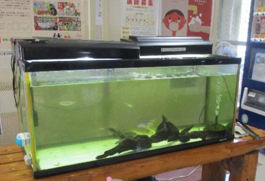 | 水槽には、フナやコイ、シマドジョウなどの魚たちが住んでいて、汚れが日々たまりますので、ベストな状態を保つために10日に1回水替えを行っています。 水槽の魚たちは、英彦山を水源とした彦山川に生息している生き物たちで、青年の家を利用した子どもたちは珍しい魚たちにくぎ付けになっている姿も見られます。 青年の家に来られた際は、魚たちも見られてはいかがでしょうか。魚たちも元気な姿でお待ちしておりますよ。 |