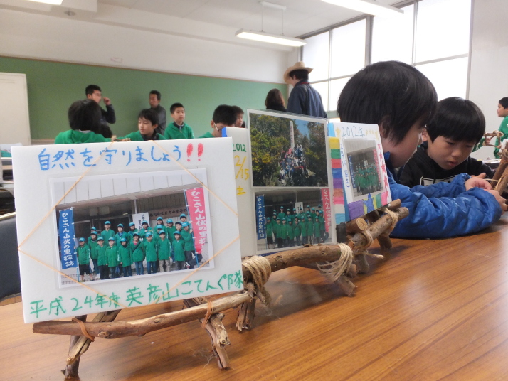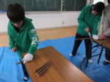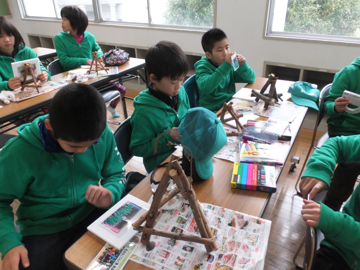 12月15日(土)に旧英彦中学校で「英彦山小てんぐ塾」に参加している子どもたちが、英彦山の自然環境保全について学んだ後、間伐材を活用したイーゼル(写真立て)作りを行いました。