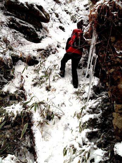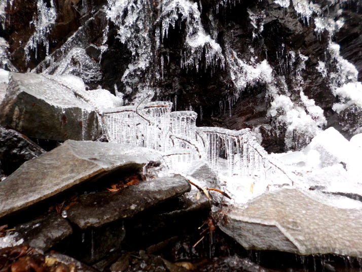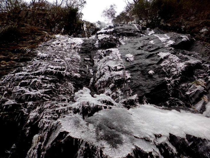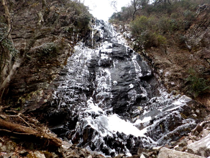昨年に比べると氷の量が少なかったようです。今回は少しだけ滝の姿を見ることができました。登山ルートは、昨年の豪雨災害により崩落している危険個所があり、目印もなくルートもわかりにくくなっています。添田町が看板に提示している注意事項に留意してください。 |