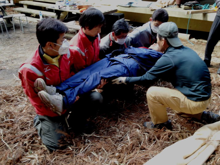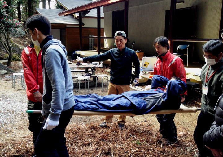 来年度の主催事業に向けて、スタッフの研修を行いました。今回は阿蘇広域消防本部小隊長の薄井良文先生の指導のもと、「緊急時の搬送法」などの研修を行いました。要救者の状況を確認しながら複数のスタッフの力で安全に搬送する技術を学びました。