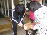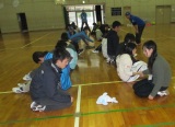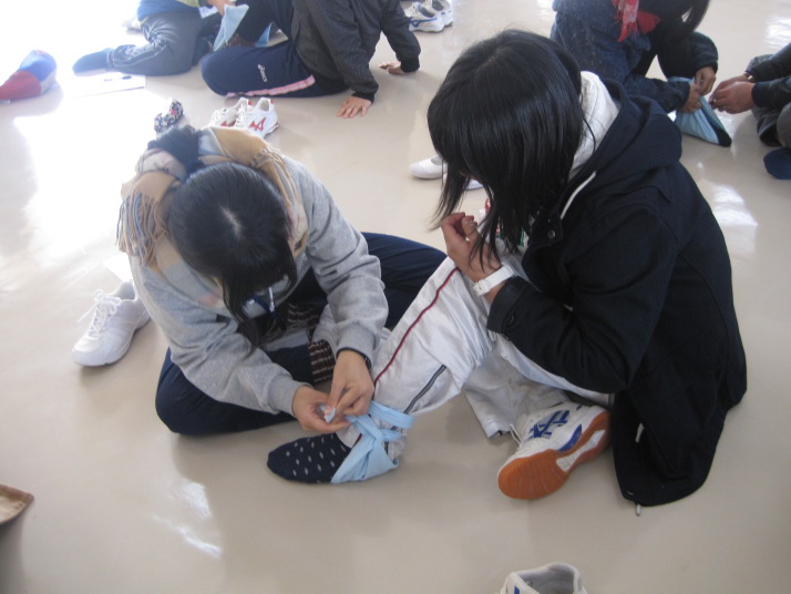 ↑三角巾を使った対処を行う参加者 |