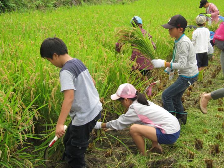 春編で田植えをして3ヶ月がたちました。水田の稲は順調に育ち、稲穂が付きはじめています。秋編では、稲刈り・ヤマメのつかみ取り・郷土料理体験・サツマイモ収穫・カカシ作りを予定しています。9月7日の稲刈りを楽しみにしていてください。 |