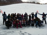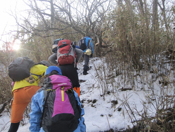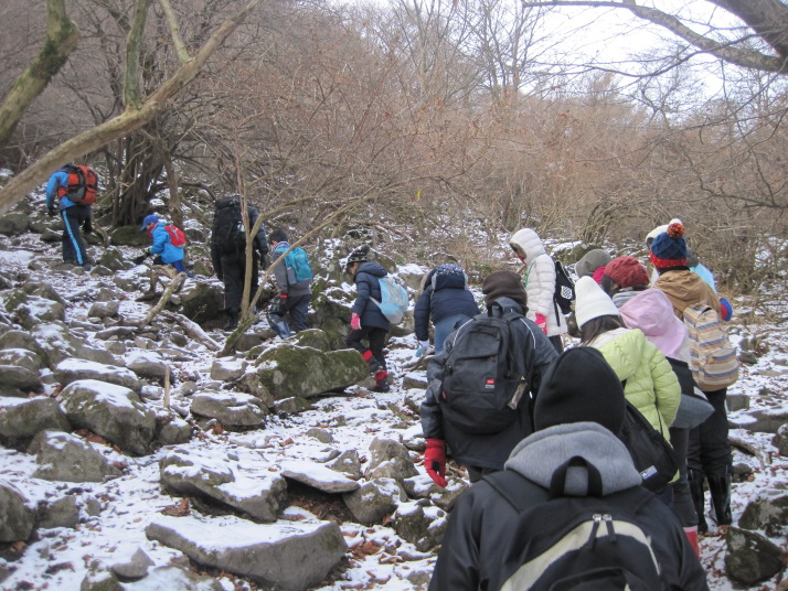 2日目は、いよいよ雪山登山、青年の家〜北西尾根〜中岳〜奉幣殿までのルートでした。数日前の雪で、北西尾根に入ると雪が思った以上にあり、アイゼンを装着しての登山となりました。山頂は風もなく、穏やかな天候で、景色もよく、とても気持ちのいいものでした。全員けがもなく、無事に登山を終えることができました。 |