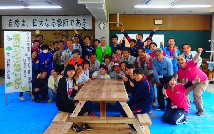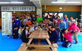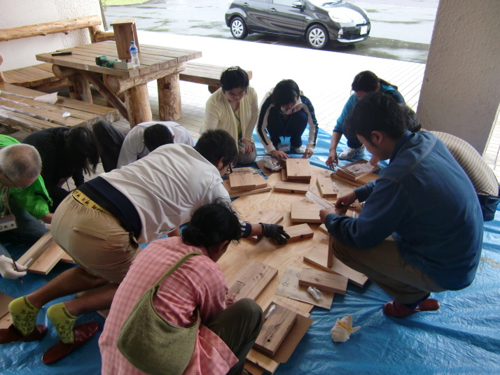 午後からは筑豊地区女性林業研究グループの荒木光子先生、添田木材有限会社の角田仁先生、山本寅文先生による実習『間伐材ものづくり体験』が行われました。午後は、『間伐材ものづくり体験』がありました。活動では、個人用の椅子とキャンプ場で使うテーブルを作りました。今回は木製品の良さと間伐材利用の大切さに気付いてもらう目的で行いました。最後には立派な椅子とテーブルが完成し、参加者は大満足でした。間伐材を使って作った作品は、とても温かみを感じました。