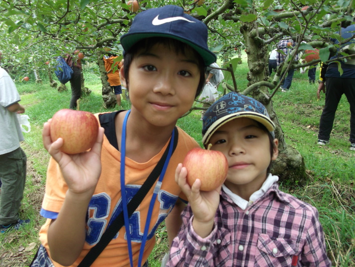 さらに「りんご狩り体験」では、星野りんご園の方からおいしいりんごの見分け方を教えていただきました。りんご園の方の話を生かし、保護者の方が、高い位置にあるりんごをお子さんに取ってあげたり、お子さんを抱きかかえて、りんごを取ったりして、ご家族で協力しておいしそうなりんごを収穫していました。どのご家族もりんごをたくさん収穫できたようで、みなさん大満足でした。