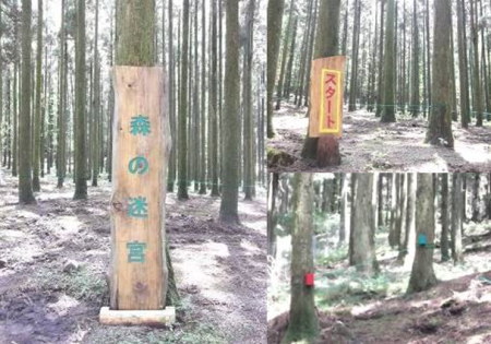 | 英彦山の森の中に巨大迷路『森の迷宮』が誕生しました。ゴールまでの時間を競う『タイムトライアル』や看板を探してクイズに答える『迷宮探索』など自然を感じながらさまざまな遊び方が楽しめます。一般の方にも資料を提供いたしますので、お気軽に事務室にお声かけください。 |