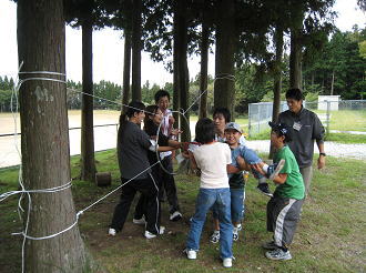 1日目の山チャレンジ1では、「魔法の絨毯」や「ボールトローリー」、「スパイダーネット」などの友だちと力を合わせながら課題解決を図るアクティビティに取り組みました。また山チャレンジ2では、高住神社まで英彦山のわき水を汲みに行き、その水を 使って、野外調理を行いました。