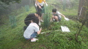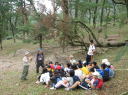 ・英彦山の頂上付近でブナ林について学ぶ子どもの様子 |