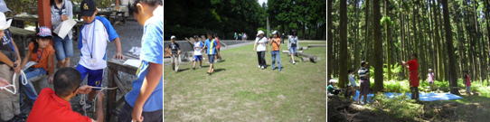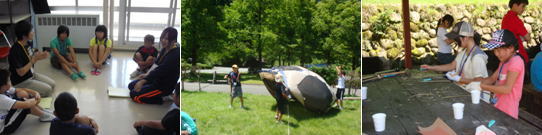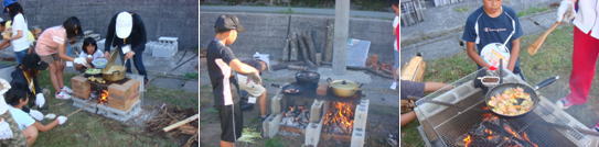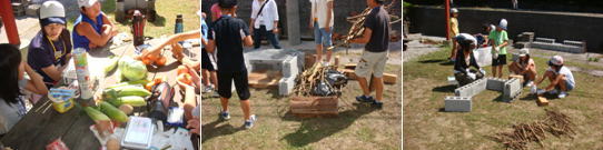 | ↑5日間の食事の話し合い ↑協力しての薪拾い ↑知恵を出し合いながらのかまど作り |