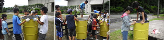 フォトラリー終了後、参加者達はドラム缶風呂の準備を行いました。怪我のないようにドラム缶を運んだり、バケツにお湯を入れて運んだりとお互いに声を掛け合って協力して行いました。ドラム缶の設置が終わった後は、お風呂に入ることが待ち遠しいようでドラム缶の中をのぞき込んでみたり指を突っ込んでみたりする人が多くいました。 |