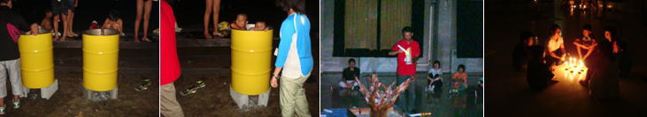 最後の夕食後、いよいよ待ちに待ったドラム缶風呂でした。満天の星空の下での入浴とはなりませんでしたが、どの参加者も気持ちよさそうにドラム缶風呂に入っていました。ドラム缶風呂の後は、キャンドルのつどいを行いました。4日間お世話になったかまどの火やスタッフのみんなに感謝の気持ちを持ったり、キャンプのこれまでをふり返ったりしました。キャンドルを囲んでのふり返りは、幻想的な雰囲気に包まれました。 |