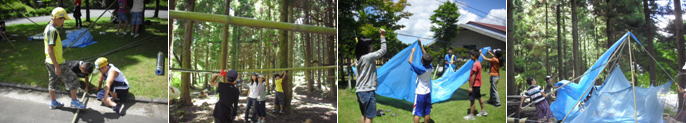 | ↑協力しての竹切り ↑杉林を利用した基地作り ↑洗濯ひもを使った基地作り ↑やぐらへのシートかけ |