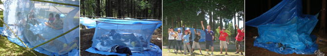 基地作りが終わると、できあがった基地に入って休憩したり昼寝をしたり、完成をみんなで喜び合ったりする班があり、完成したときの子ども達の喜びは大きなものがありました。しかし残念ながら、この日の夜は風がとても強かったため、基地で就寝することをどの班も中止しました。 |