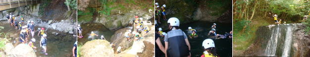 | ↑上流目指して出発 ↑みんなで協力しての沢登り ↑3滝の上からジャンプ ↑滝壺での遊泳 |