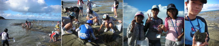 藍島の千畳敷海岸で散策を行いました。藍島千畳敷は大潮の干潮時に広大な岩場が現れるとても美しい海岸です。海岸に生息している生き物や貝殻、化石などいろいろなものを収集しました。