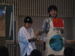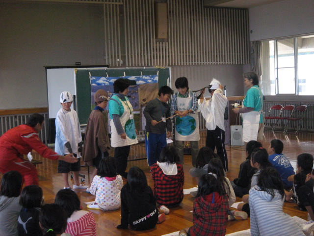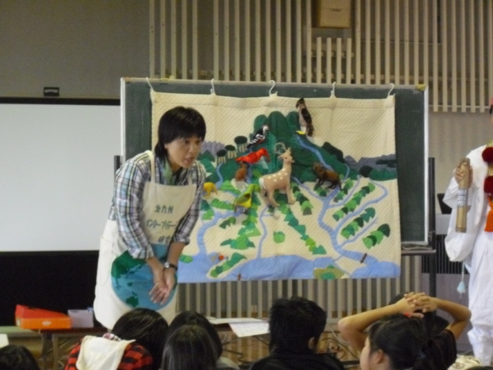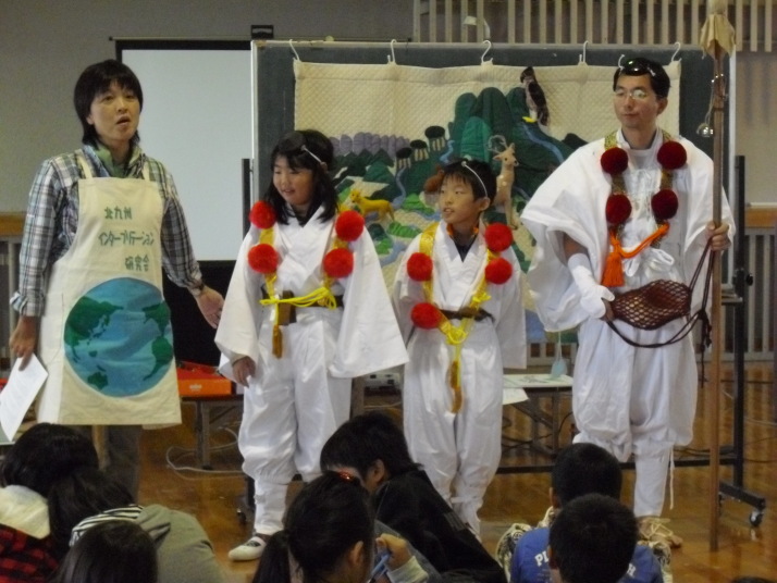 北九州インタープリテーション研究会の方々による布絵シアターを観ました。曽根干潟の生き物たちの様子が四季を通じて変わることや、海と川、山はつながりが深いことなどを知ることができました。途中、子どもたちが野鳥に扮したり、山伏が登場したりして楽しみながら学ぶことができました。
