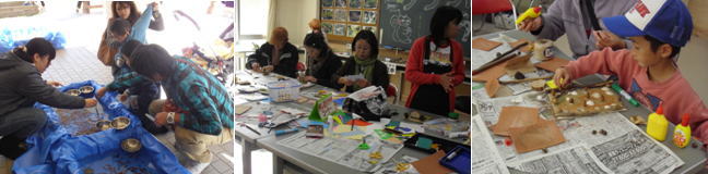 | ↑上手に、金魚がすくえたかな? ↑飾り付けに、大人も夢中! ↑どんぐりを、ここに置いてっと・・ |