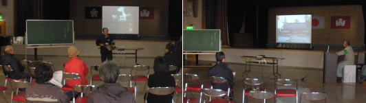 ↑ミニ歴史講座でのほら貝実演 ↑ミニ歴史講座での説明風景