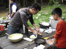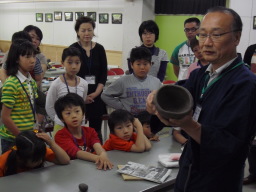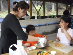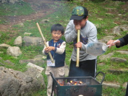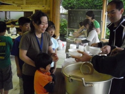 事業前から空模様が心配されましたが、参加家族の熱意が天に通じ、雨が降りつつも活動するには影響が無いほどに恵まれました。陶芸体験では、講師である藤崎寿山先生の丁寧な指導の下、全員が和やかな雰囲気の中で活動することができました。子ども達の器用な手つきとは対照的に、悪戦苦闘する保護者の方々の姿が印象的でした。夕食の野外調理では、一生懸命に調理や火起こしのお手伝いをする子ども達の姿が見られました。参加家族それぞれにダッチオーブンやバーベキューコンロを駆使して、盛り沢山の料理が完成していました。活動の合間を利用して、レクリエーションを行った結果、子ども達が大変仲良くなり、夕食時間や休憩時間に一緒に遊ぶようになりました。農業体験では、講師である松崎一章先生から苗の植え方等を説明していただき、意欲を持って田植えに臨むことができました。水田に入ったときは悲鳴のような声があちらこちらで聞こえていましたが、いざ苗を植え始めると我が子の存在さえも忘れて没頭してしまっている保護者の姿が随所に見受けられました。田植え後は、農業指導補助に入っていただいた上津野の方々とも一緒に昼食をいただき、参加家族へ「命をいただく」ことや「感謝する気持ち」の大切さ等を、農業従事経験を元にしたお話を語っていただきました。