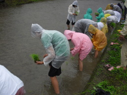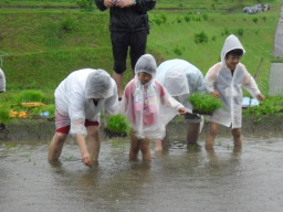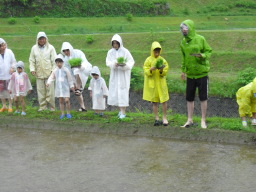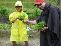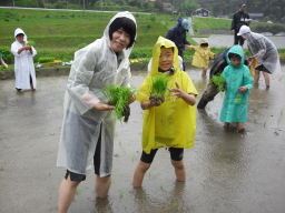 前日からの雨で田植え体験を諦めていたのですが、地域の皆さんのご好意で雨の中田植え体験を決行して下さり、とてもよい体験ができました。