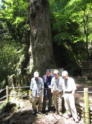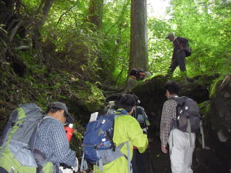 | 登山Aコースは、南岳を通って中岳山頂を目指す上級登山コースです。日本体育協会山岳上級コーチの園川陽造先生に同行していただきました。途中、国の天然記念物に指定されている鬼杉や材木石を見たり、園川先生から登山における注意点や楽しみ方をお話していただいたりしました。英彦山の中でも一番の難コースでしたので、踏破した達成感もひとしおだったようです。 |