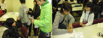 次に知らない友達と仲良くなるために、自己紹介を兼ねたじゃんけんゲームを行いました。一人でも多くの友達に自己紹介を行い、じゃんけんに勝ったら自分が持っている紙に名前を書いてもらって、たくさんの仲間と交流ができたようです。(写真BC) |