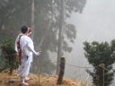 | 写真撮影実習のため約40分かけて玉屋神社へ歩いていきました。途中、急な上り坂などもありましたが、「あともう少し、頑張ろう!」と互いに励まし合いながら、みんなで頑張って歩いていきました。玉屋神社では、撮影モデルとして青年の家職員が扮する“山伏”が登場した際には、皆さん真剣な眼差しでシャッターを切っていました。 |