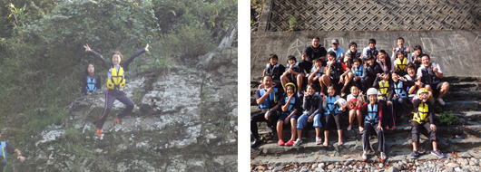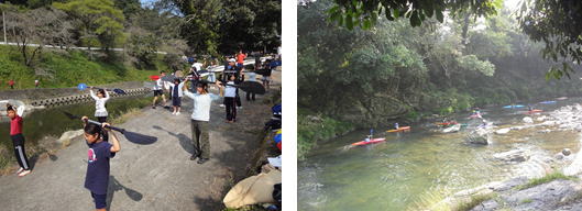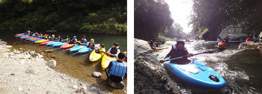 | 八女市八幡校区健全育成会からカヌーを貸していただき、星野川のきれいな川で楽しみにしていたカヌー体験を行いました。カヌー操作の上達が早く、全員が流れの早い渓流にチャレンジしていました。素晴らしい景色ときれいな川の中で楽しく活動できました。 |