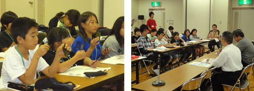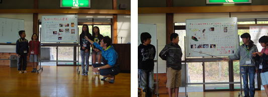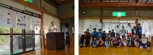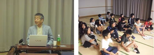 | 翌日のグループ別学習に向けて、NPO法人グラウンドワーク福岡の大谷先生をお招きして、事前学習を行いました。様々な活動のスライドを見たり、東日本大震災のビデオを見たりしました。環境について学習する中で、その地域の歴史や文化も学ぶことが大切であることを学び、明日の活動への意欲が高まりました。 |