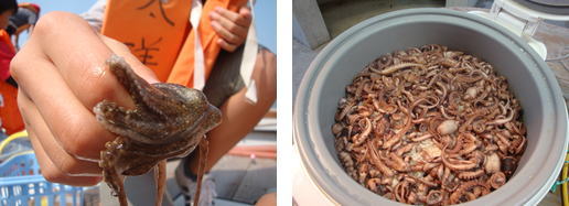 | 漁船に乗って海苔養殖場見学とタコ釣りに行きました。初めて漁船に乗る子どもたちもいて「大丈夫かな」「気分が悪くならないかな」など不安な気持ちを持って出発しました。しかし、海に出たら海苔の養殖用の竿を見たら子どもたちもびっくり、タコを釣ったらびっくり初めて体験することばかりで不安な気持ちも吹き飛んだようでした。 |