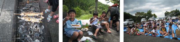 やまめつかみ取りでは、初めは嫌がっていた子も最後には一生懸命にやまめと格闘していました。親も子どもに格好いいところを見せようとはりきってつかみ取りを行っていました。みんな、しっかり自分の食べるやまめをゲットしました。 |