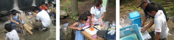| 参加した親子の皆さんからは「ゆっくりとした時間配分で、子連れのキャンプなので良かった。」「ダッチオーブン、薪割りなど日頃できない体験が家族でできた。」「ダッチオーブン相手にとまどわなくなっている自分に驚いた。」「子どもがはりきって、火の番をしたのには驚きました。」「沢のぼりとても楽しかったです。大人も夢中になりました。」「いい遊び場を教えていただきました。」など、自然の中で活動体験を満喫した、感想をたくさんいただきました。 |