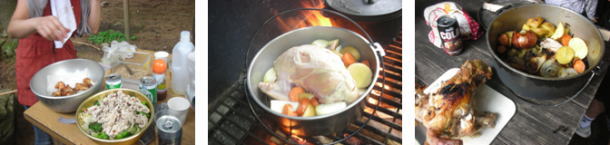 メニューは事前に家族で話し合い決めてもらいました。ただし、今回はダッチオーブンを使用するという課題をつくりました。当日までどの家族も十分に話し合いをしていただいたおかげで、素晴らしい料理がたくさんできました。鶏を一匹ダッチオーブンに入れてのローストチキン、ピザ、餃子など様々な料理が完成しました。どの家庭も初めてのダッチオーブンでの料理で不安がいっぱいでしたが、実際に作ってみてダッチオーブンに興味を持たれたようでした。本当にどの家庭の料理もおいしかったです。 |