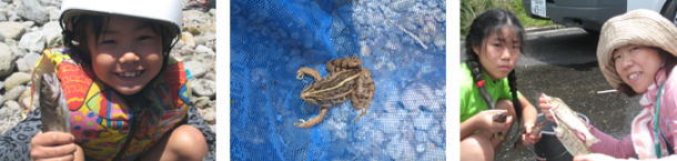 | ↑やまめ捕まえたぞ〜 ↑カエルも捕まえたよ! ↑ やまめの内臓を取って塩焼きに! |