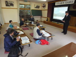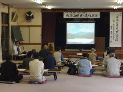 英彦山神宮参集殿で出会いのつどいを終えた後、添田町教育委員会文化財係長 岩本 教之 氏を講師にお招きし、「幕末の英彦山と日田」の演題でご講演いただきました。当時、英彦山と日田をつなぐ主要道であった岳滅鬼峠の話や、幕末の動乱期に討幕運動に関わった十一人の英彦山山伏が悲運な最期を遂げたことなど興味深い話をたくさん聴くことができました。