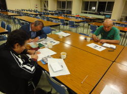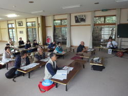 | 夜は、参加者相互の交流を深めることを目的として俳句交流会を行いました。午前中の講演や午後の史跡巡りをとおして思ったことや感じたことをもとに、参加者の方々に俳句を作っていただきました。みなさん頭を悩ませながらも、いい作品を作ろうと熱心に俳句作りに取り組んでいました。できた作品を紹介し合い、よいと思う作品にそれぞれが投票して、得票を競い合うという句会形式で会を進めていきました。俳句を作るのが初めてで、交流会に消極的だった参加者もいらっしゃいましたが、自分の作品に票が入るととても嬉しそうな表情を浮かべていました。句会をとおしてそれぞれの参加者の思いにふれるとともに、参加者同士の会話もさらに弾むようになり充実した楽しい交流会となったように思います。 |