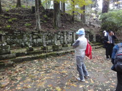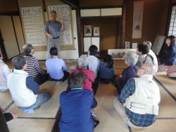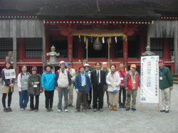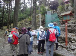 | 午後は、添田町観光ガイドボランティアの松養 榮貞さん、上原 明美さんの案内のもと、英彦山神宮表参道周辺の史跡巡りを行いました。奉幣殿から出発し、約3時間かけて廣瀬淡窓詩碑、修験道館、招魂社、顕揚坊、長三州塾跡等、表参道に残る貴重な文化遺産を見学しました。途中雨に降られましたが、雨宿りをさせていただいた松養坊で、普段見ることのできない松養坊邸内の貴重な資料等も見せていただき、参加者の方々も大満足の様子でした。 |