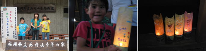 宿泊は、バンガローを使用しました。バンガローの入り口には、自分で作った竹灯篭を置き、夜が更けるとともに幻想的な光が浮かび上がりました。(活動A写真)