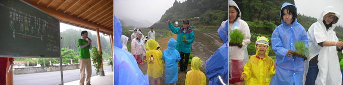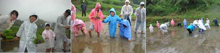 | ↑ 田植えのベテランファミリー ↑田植えは楽しいな ↑みんな一生懸命に頑張りました |