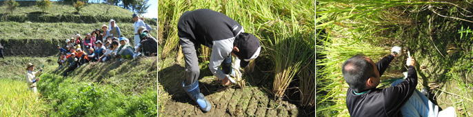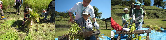第1回の田植え後の稲の成長に驚くとともに収穫する喜びも同時に味わいました。参加者の皆さんは、稲刈りに対する意欲がとても高く、稲刈りは予定の時間よりも早く終了しました。稲刈り後の脱穀体験では、江戸時代中期以降に広まったの脱穀器のひとつであった「千歯こき」を使いましたが、時間や労力を使うため、現代の機械化された稲刈りや脱穀の効率の良さと昔の稲刈りの大変さを体感することができました。