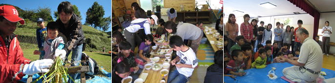 昼食は、地元の「上津野村づくり協議会」のボランティアの方々による炊き出しを行ってもらい、新米と山菜料理をいただきました。また、地元の方々との交流も深めました。