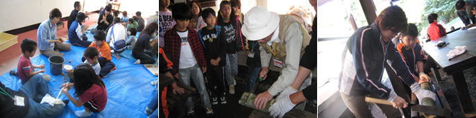 午後からは、豊前面伝統工芸士の篠ア臣秀氏から地元のお土産で有名な「英彦山がらがら」と「七福神」の作り方を指導していただきました。参加者は家に飾る縁起ものということもあって、大人も子供も夢中になって一生懸命に取り組んでいました。