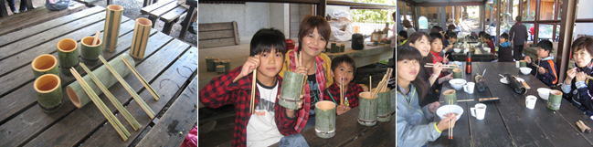 ・竹を使ってご飯を炊いたり、箸や茶碗を作ったり楽しい体験ができました。