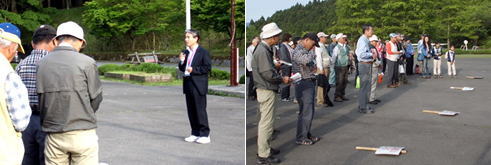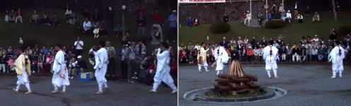 | 1日目は、夏山シーズンの到来を告げる、添田町の行事「英彦山山開き前夜祭」に参加しました。当日は晴天に恵まれ、前夜祭恒例のまさかり舞いや山伏問答、彦山踊りなどの出し物に加え、地元の添田中学校吹奏楽部の共演により、祭りは大変な盛り上がりをみせました。祭りの後には、焼き鳥やカッポ酒が振舞われ、参加者の皆さん大変満足された様子でした。 |