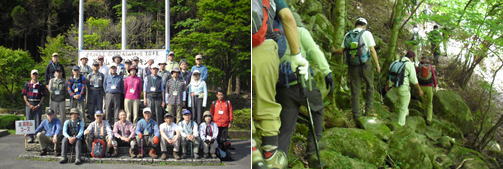 英彦山の裏ルートを歩くこのコースには日本体育協会上級スポーツ指導員の瀧口文三氏、添田町観光ガイドボランティアの早田利光氏を講師に招きました。